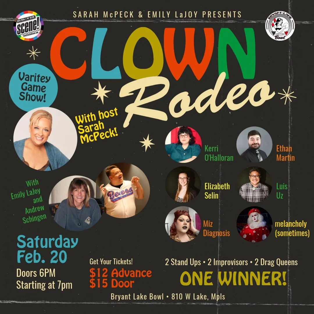 Get ready for a wild ride at Clown Rodeo, the game show that's on a quest to find the true clown! Hosted by Minneapolis's own comedian Sarah McPeck and her trusty clown sidekick, Drew, this isn't your average rodeo. Cast includes Kerri O’Halloran, Ethan Martin, Elizabeth Selin, Luis Uz, Mia Diagnosis, and melancholy (sometimes).