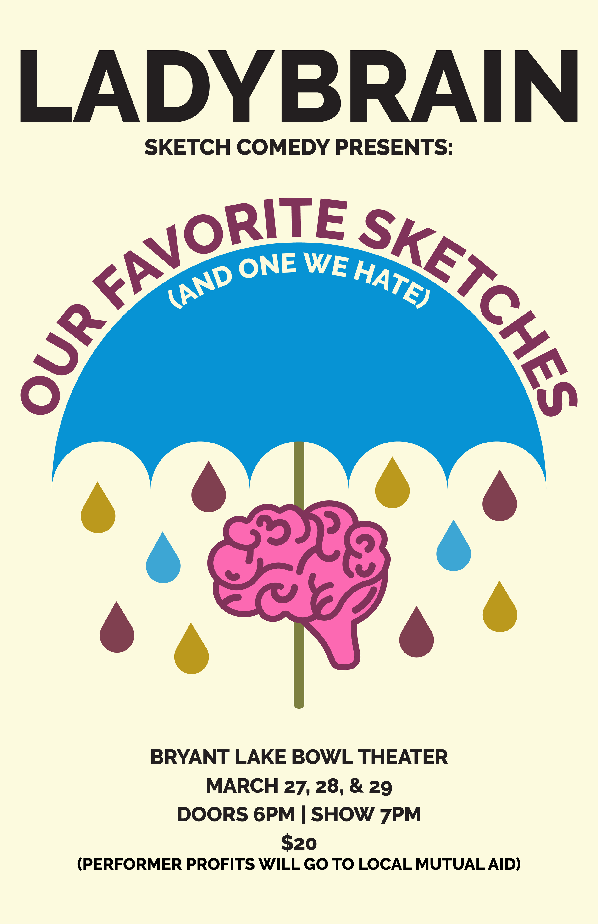 In a time when very little feels funny, Ladybrain is bringing back fan-favorite sketches for a supercharged, mega-awesome night of sketch comedy. During their 8 years as a group, Ladybrain has amassed a vast repertoire of sketches that deserve another day in the spotlight…and now’s their chance! From muppet martial arts to those times when your brain simply won’t leave you alone, there’s something for everyone in this wacky revue!